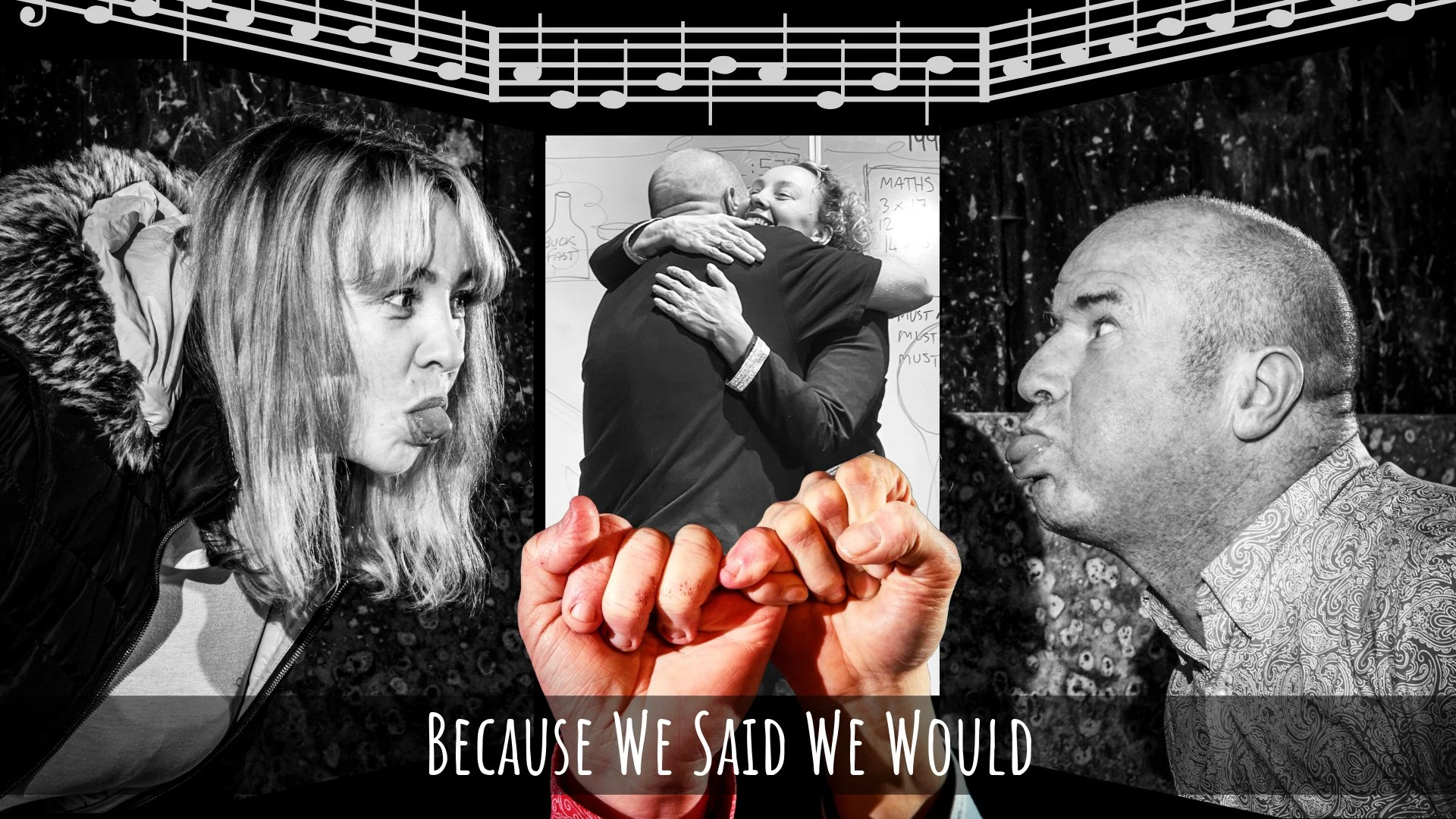 Because We Said We Would is set in a white board world where the scenes and additional characters are drawn throughout.