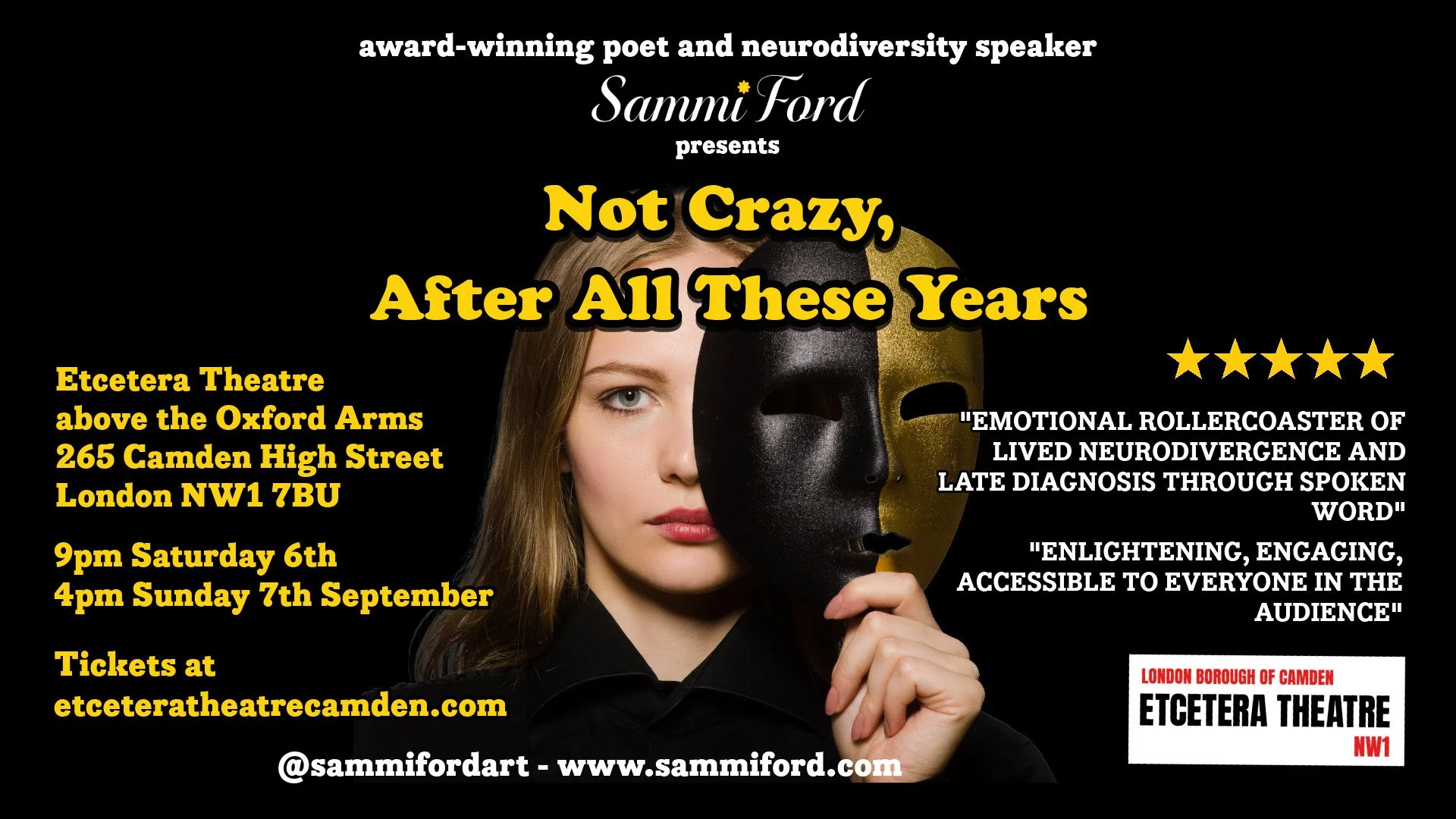 Shortly after her appearances at the National Neurodiversity Shows, Into The Wild Festival and the Royal Festival Hall, join Sammi on an emotional rollercoaster ride as she blends poetry, comedy and narrative to tell stories of her crazy journey through life before a revelatory late diagnosis of autism, ADHD and OCD in her early 50s. Expect laughter and tears through the highs and the lows as a precocious Elvis-obsessed child, RAF officer, international businesswoman and concert photographer, before menopause and a mental health crash into the unknown. Discover why daily activities can be so difficult for neurodivergent people, learn fun facts through science and ponder on what it is means to be neurotypical.